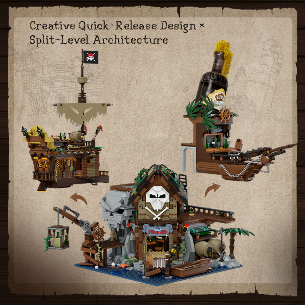 Il modello è completamente modulare: le pareti si aprono per svelare interni affascinanti come il bancone del bar, la cucina, il caminetto, camere segrete e perfino un pub costruito sullo scafo di una nave al primo piano. Ogni ambiente è ricco di dettagli accuratissimi: bottiglie, boccali, barili, scaffali, forzieri del tesoro, finestre a grata e persino un topolino nascosto nel sottotetto. L’estetica è colorata e giocosa, con minifigure in stile cartoon, perfette per grandi e piccini.